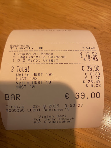 Food was really nice from here and in a nice location... unfortunately that's the only positives. We visited last Tuesday evening and the service was slow. After finishing our food, waiters continually walked past our table with empty plates and never said anything to us. In the end I had to ask for the bill, whilst our plates were cleared and we were not asked how our food was at all. Surprisingly, there was no hard copy of a bill, the man just said "€34.50" each. Me and my partner had decided to split the bill and my half was €24 and his was €26. We clearly had not eaten €69 worth of food!!!! I then challenged this with the man and he got all flustered and tried showing me the menu as if I was wrong. I then showed him everything on the calculator so at this point he could no longer try and overcharge us. Me and my partner paid in cash and I pulled out €50 euros and put it on the table as I was about to take €20 out and give just €30 to the man. He snatched my €50 euros off the table and took €30 off my boyfriend and was pretending he had took €60 euros off us not €80!!!! I literally had to pull my €20 euros out of his hand to avoid getting scammed!!!! Will not be returning and my parents are coming to Berlin in October and they have been made aware to steer clear of...