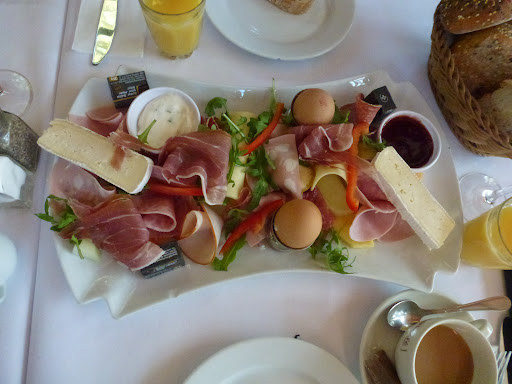 Milanese salami, spicy Italian salami, ham, turkey breast, liver sausage, gouda, cole slaw, jam, boiled egg, butter, a basket of bread and fresh fruits