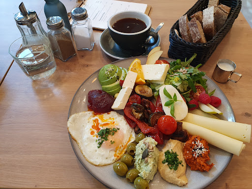 Es gibt eine vielfältige Auswahl an Speisen (Frühstück, Bowls, Kuchen, etc.) und Getränken. Ich probierte das vegetarische Frühstück, was eine sehr gute Wahl war. Auf dem Teller waren u.a. verschiedene Pasten, Käsesorten, Salat, Avocado, Tomaten, ein Spiegelei und etwas Marmelade. Dazu gab es reichlich Brot (das war lecker; zwei Sorten zur Auswahl wären perfekt). Der Kaffee Americano schmeckte gut und kam mit einem Glas Wasser.