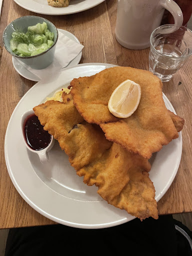 Thin menu. Overpriced schnitzel was bland with paperthin meat enveloped in a fluffy bread coating. I don’t recommend it. Trout dish is average and unmemorable. Good selection of wines and beers.