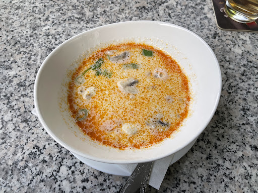 Essen: Wir haben das 2-Personen-Menü Phnom Penh bestellt. Das Essen haben wir nur pikant statt scharf gewünscht, was uns erfüllt wurde. Es war sehr lecker. Die Suppe wurde mit Fisch statt Krebsfleisch angeboten, was auch super war. Das Lamm mit Feigen war in leckerer würziger dunkler Sauce und die Garnelen und der Tintenfisch in einer ebenfalls guten Kokosmilchsauce. Der Nachtisch mit gebackenen Bananen war sehr süß, aber ein perfekter köstlicher Abschluss des Essens. Die verwendeten Zutaten waren frisch und knackig und alles wurde merklich frisch zubereitet.
