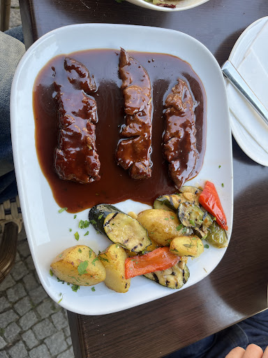 The lamb fillet was extremely disappointing. It consisted of three small pieces completely covered in a cornstarch sauce that had the frozen appearance and taste reminiscent of a store-bought meal. The lamb was not seared, resulting in a dense texture as if it had been boiled rather than cooked with care. Additionally, the lamb strips were drenched in an overly sweet barbecue-like sauce that did nothing to complement the meat. Overall, the dish was unappetizing and not worth the €20 price tag. The lamb was thin, dry, and lacked any of the juiciness one would expect from a well-prepared fillet.