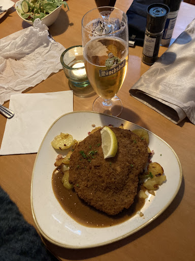 Read moreI had a wonderful meal here, very what you'd expect it to be, "Schnitzel mit Kartoffeln Salat" washed down by a clear beer, a cup of coffee and a chocolate souffle for desert. As we were the firsts to arrive at lunch time we were sat down by a window so people walking doww the street could see us, not "us" but customers having a good time eating there and be invited in. At the end of the meal we each paid 28+tip which is a good price for the lot. All in all it was a good experience and I...