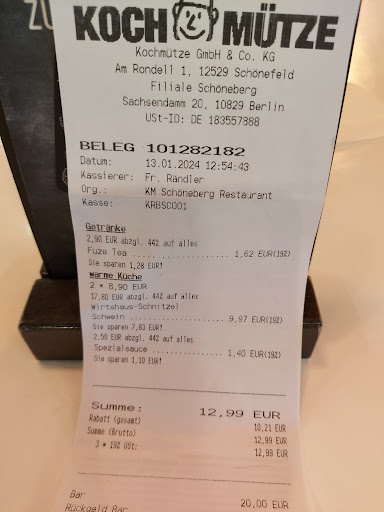 Read moreAlso zunächst einmal. Die Kochmütze ist ein Restaurant im 3. OG vom Möbel Höffner. Also eher vergleichbar mit einer Kantine oder dem schwedischen Konkurrenten. Und auf dem Level ist die Kochmütze Tip Top. Ich arbeite nebenan und gehe oft in meiner Mittagspause hier essen. Sehr oft die Currywurst Berliner Art(Krautsalat und Röstzwiebeln) mit Pommes, die sich nicht verstecken braucht, ich hatte aber auch schon Kalbsrouladen mit Apfelrotkohl und Kartoffeln, sehr lecker und fruchtig, und heute gabs Beelitzer Spargel, Schnitzel, Holondaise und Kartoffeln. Alles sehr sehr lecker. Preise sind super günstig. Daher verstehe ich die negativen Bewertungen nicht. Klar wenn ich jeden Tag bei "Maredo", mein 80 Euro Steak esse, habe ich hier nichts zu suchen, aber das ist auch garnicht der Anspruch. Ambiente ist sehr schön, auch hier Top Niveau. Wenn man ein Fensterplatz ergattert hat man auch noch eine tolle Aussicht. Wer lecker, günstig und ein angenehmes Ambiente möchte, ist hier genau richtig.
