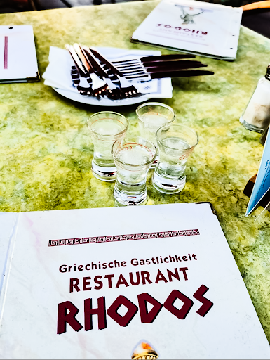 Ich hab mein Essen dann mit jemanden am Tisch getauscht. Je länger der Abend, um so voller und um so lauter wird es im Rhodos. Der Wirt fordert jeden Tisch, bei dem er ständig Ouzo in alle Gläser nachfüllt (er selbst trinkt dann auch immer stets mit) zum lautstarkten scandieren "Das ist RHODOS!!!" Jeder, der seit Jahren da hingeht, kennt dies und es gibt einige, die gehen eigentlich nur wegen des stätigen Nachschub an kostenlosen Ouzo dahin.