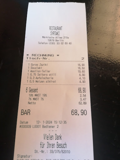 Read moreBin echt enttäuscht. War das zweite Mal hier und alles bestätigt sich. Service ist besonders schlecht. Es kommt jemand zu Tisch und zündet noch nicht Mal die Kerze an, einfach traurig. Die Preise sind in Ordnung. Jedoch bekommt man bei den Beilagen viel zu wenig Zaziki. Der Grieche hat normalerweise den Ruf dafür, für seinen Preis viel zu bieten für wenig Geld. Klar wir haben eine Inflation aber sowas ist zu wenig. Das was als Zaziki auf den Teller ist, ist für Fleisch und Pommes einfach zu wenig, mehr nicht. Es gibt nicht mal Mayonnaise oder Keepschup zu den Pommes dazu, einfach traurig. Und wenn man was dazu bestellt, dann auch noch aus der Packung.