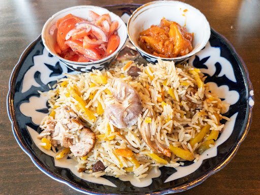 Pilaf (aka plov or osh) is a traditional Central Asian dish, particularly popular in Uzbekistan. It consists of rice, meat (often lamb or beef), carrots, and a mix of spices. The dish is cooked in a large, heavy cauldron called a "kazan." The rice is seasoned with ingredients like cumin, coriander, garlic, and sometimes dried fruits like raisins.