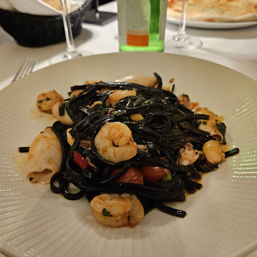 Food is delicious, portions are good. The wine of the house was amazing. Although, the dishes were delicious, they were, let's say, variations on the Italian kitchen : black pasta was not with the real ink, the pieces of garlic and chilli pepper (that should be taken away) were in the dish, pasta was not long (i think they broke it before cooking), pizza 4 cheeses was pale, slices of strange cheese were added, they did not even melt.
