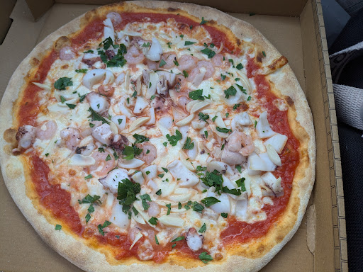1 Aussehen: Die erste Pizza triefte nur so vor fett(erste Fotos) und Öl! Es war das erste Mal, das ich im Auto nachgeschaut habe und die Pizza zurück gegeben habe! Das wollte ich nicht mal probieren! Also wieder rein ins Restaurant, da wurde ich schon begrüßt und sofort wurde mir eine neue Pizza gemacht! Die zweite sah dann schon viiiiel besser aus! Frische Kräuter, gut mit Scampis und Tintenfisch belegt. Wie mir vom Kellner( der übrigens unfassbar freundlich war) gesagt wurde, das die Meeresfrüchte eingelegt und nicht frisch sind. Es wird von den Kunden halt so gewünscht. Gut, kann ich nicht verstehen wenn man eine Frische Pizza haben will. Vor allem nicht mit soviel Öl. Aber das wurde ja bei meiner zweiten korrigiert