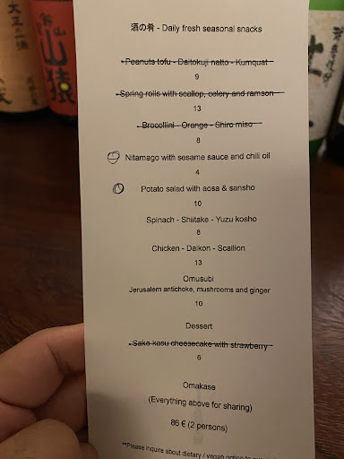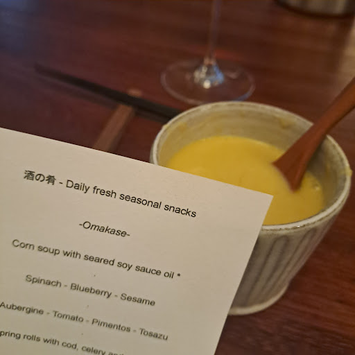 Read moreThis is a great place for drinks and nibbles, and the service is outstanding, but my wife and I found the menu disappointing and way overpriced (having paid 130 euros for the two of us for the menu de dégustation and a drink each). The bright side: the Japanese gin (try Kanomori if they have it) is truly outstanding and their whisky is also very good. And the waiters are friendly. The not so bright: out of the 8 dishes on the menu we found only 2 truly delicious (the Kaki with spinach & sesame and the Chestnut kefir soup). 5 were okay but nothing more than that, and one was quite bland actually (the omusubi). (Something on the menu upset my wife’s stomach, but I don’t want to blame the restaurant for that, since I was okay the next day.) The plus side is that the ingredients are seasonal and of high quality. The chef also knows how to balance flavors. But I’d expect more than this...