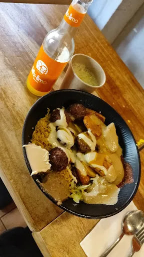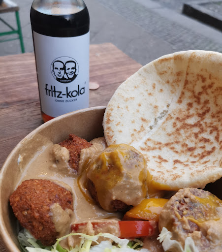Essen 2/5: Nun ja, im Gegensatz zu den anderen hohen Bewertungen, bin ich hier defintiv anderer Meinung, hier geht wesentlich mehr für ein liebevolles Mahl nach orientalischer oder nord afrikanischer art . Ich habe sowohl ein Sandwich, als auch einen Teller probiert, beides hat mich nicht weggehauen. Der Teller wird mit übermäßiger Erdnussauce zugekleistert, es fehlen frische Kräuter oder ein mehr orientalisch angehauchtes Gemüse, die Hauptbestandteile wie Halloumi, Köfte oder Hähnchen sind von einer sehr minderen Qualität. Es wird überwiegend fritiert, mein Magen freute sich nach dem Essen und grummelte mir etwas vor.