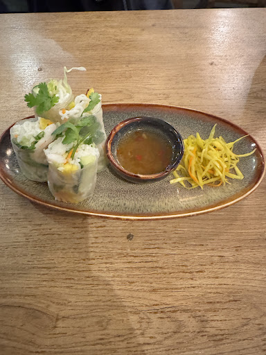 Nur kurze Zeit später kamen die Sommerrollen, die neben dem Garnelen und Koriander auch Mango enthalten sollten. Die waren leider nicht so einfach zu essen wie zu erwarten - sie zerfielen sehr schnell und einfach in ihre Einzelteile. Der Dip war wirklich frisch, aber die Sommerrollen waren geschmacklich nicht der Hit. Alles ist zwar frisch zubereitet, aber bei Sommerrollen erwarte ich ausgeprägten Koriandergeschmack und ein schönes Spiel mit der Frische der Zutaten mit dem Dip. Der Dip war leider nichts, auch wenn er wirklich frisch gemacht war. Das Ganze schmeckte sehr fad, ungesalzen und unharmonisch. Und die Rollen fielen wie gesagt sehr schnell ihre Einzelteile. Schön wäre es gewesen wenn ich Besteck oder zumindest eine Servierte bekommen hätte - aber Fehlanzeige. Die Bedienung war alleine und hat ob der Vielzahl der Gäste einiges zu tun.