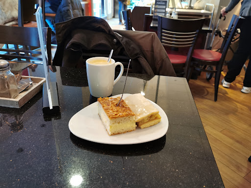 Ich habe hier heute ein mittelgroßen Kaffee getrunken. Darüber hinaus habe ein Stück Bienenstich und einen gedeckten Apfel verzehrt. Beides war sehr delicious.