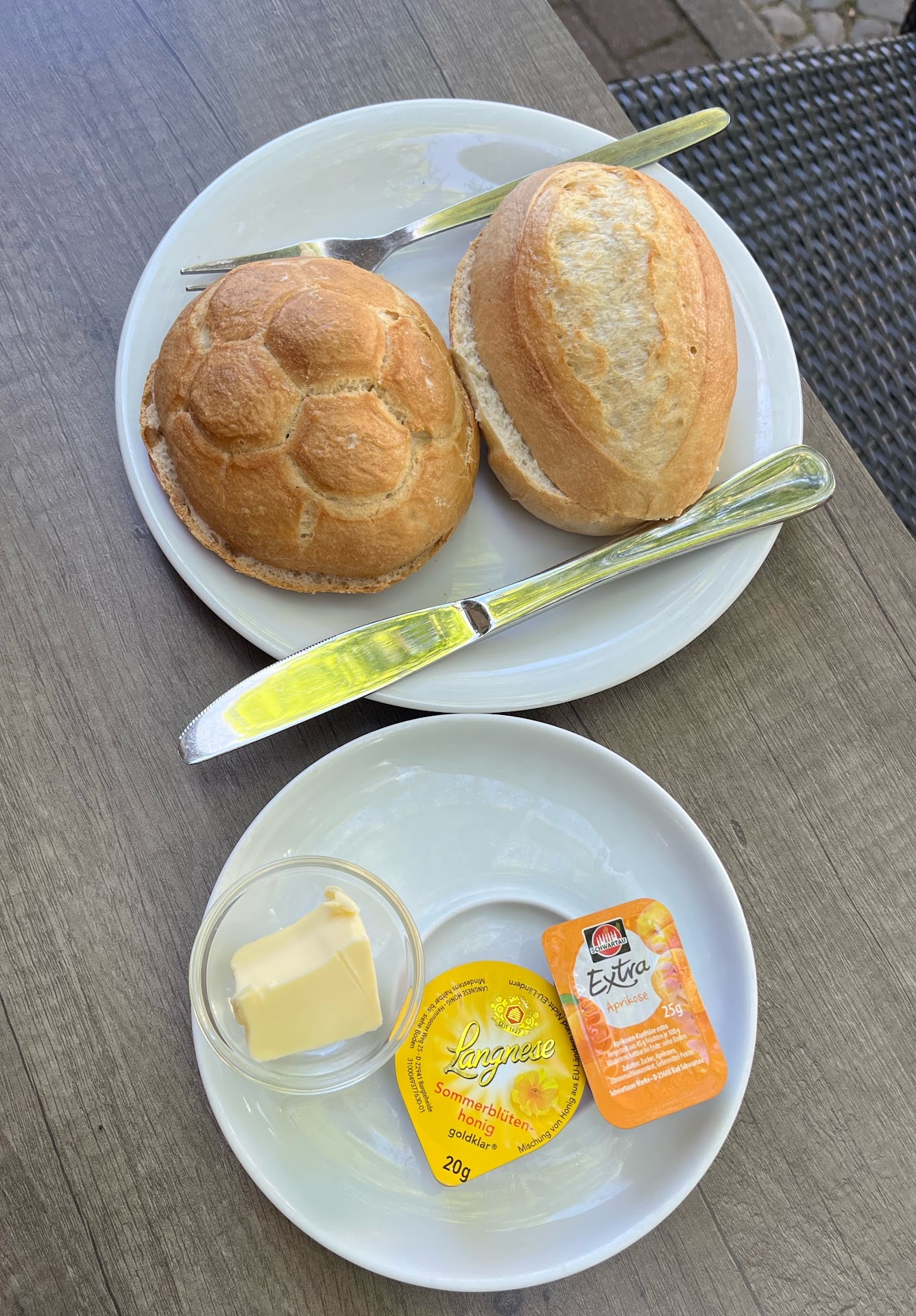Zwei Brötchen, 1 gekochtes Ei, eine kl. Marmelade, eine Scheibe Käse, eine Scheibe Kochschinken, eine Scheibe Salami Auf ein Salatblatt mit einer kleinen Scheibe Tomate und einer Gurkenscheibe sowie Butter 10.50€ (Das 2x weil wir zu dritt waren) An der Kasse die Info alles ohne Getränke, diese Kosten extra Unsere sofortige Beanstandung das auf diese Bilder die Getränke mit abgebildet sind und kein Hinweis auf gesagtes zu finden ist, bekamen wir unsere Getränke ausnahmsweise dazu!!!!!