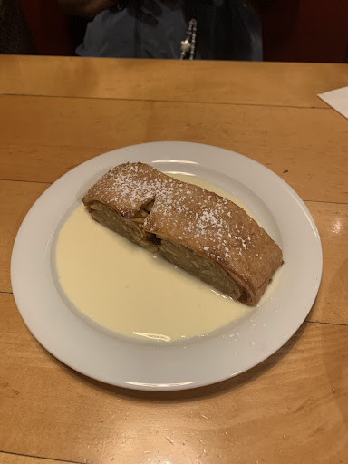 The food was interesting and quite satisfying. We chose a set meal for my wife, which came with the chef’s soup or salad. There were 5–6 main course options, and she went with the schnitzel with potatoes and mushrooms. For dessert, we had the apple strudel.