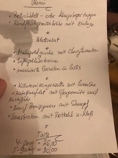 Read moreDieses Restaurant ist wirklich außergewöhnlich. Das fängt schon mal mit der Speisekarte an. Diese ist handgeschrieben und besteht aus einer DIN A4 Seite und es gibt nur ein Exemplar davon. Jeden Tag wird in der Regel nur ein vier Gänge Menü, bestehend aus einer Suppe, einem Zwischengang, einem Hauptgang und einem Dessert angeboten. Suppe und Dessert sind obligatorisch. Den Zwischengang kann man weglassen, wenn man möchte. Würde ich aber aus kulinarischen Gründen nicht empfehlen, denn hier ist man tatsächlich exquisit, auch wenn die Einrichtung des Lokals eher rustikal ist. Man erhält eine Stoffserviette auf blanken Holztischen gereicht. Inmitten des Gastraumes steht ein alter Küchenherd, welcher mit Holz beheizt wird und auf dem die zwei zur Auswahl stehenden Suppen sowie die Suppenteller, die man sich selbst holen muss, warm gehalten werden. Die restlichen Gänge des Menüs werden dann von einem „Kellner“, den ich als ein echtes Original bezeichnen möchte, am Tisch serviert. Die Preise entsprechen der ausgezeichneten Qualität der Speisen. Es ist ein großartiges Erlebnis hier zu speisen, dass man sich nicht entgehen lassen sollte, auch wenn es relativ teuer ist, so lohnt sich doch ein...