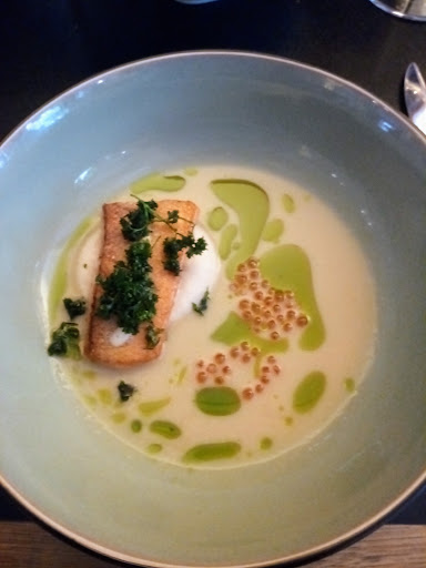 Das Ambiente des Restaurants ist durch die Weinregale, in denen scheinbar hunderte von Flaschen lagern, gemütlich, trotzdem modern und – spätestens wenn man an die Decke schaut – durchaus auch industriell. Der Service ist äußerst freundlich und entspannt, erklärt jeden Gang – auch auf gezielte Nachfragen – gerne detaillierter und kennt sich auch bezüglich der korrespondierenden Weine aus.