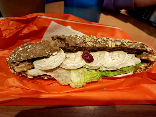 Read moreIch musste mir heute auf die schnelle Kaffee und. Was zum Frühstück holen... Habe mich für einen Latte Macchiato (der ist gut!) entschieden und ein "Honigkrustini" (Vollkornbaguette mit Salat, Ziegenkäse, Walnüssen und Cranberries...).