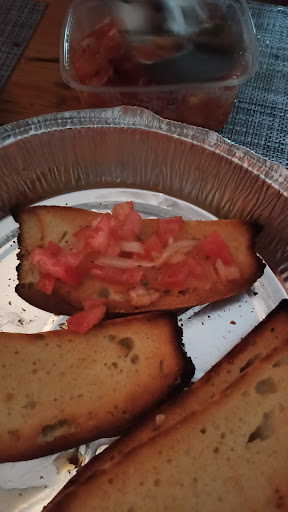 The bruschetta arrived in a do it yourself kinda way, tomatoes in a plastic box and 4 pieces of bread.