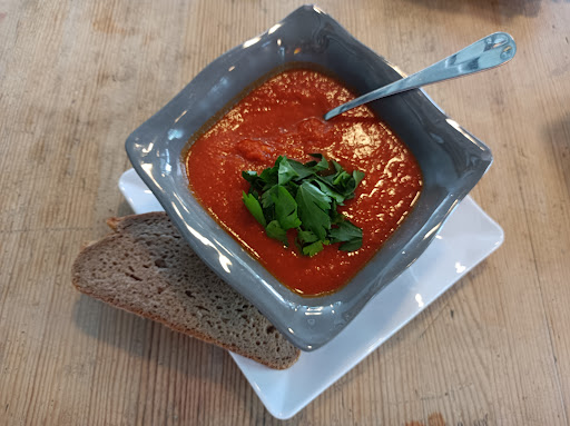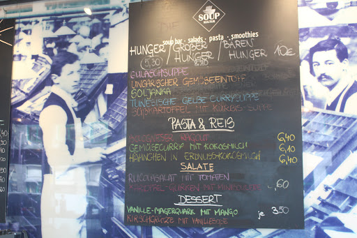 Read moreIl locale presenta diversi tavoli sia all'aperto che all'interno. Il nostro servizio è stato rapidissimo: non abbiamo dovuto aspettare per accomodarci e consumare. Le pietanze sono sia vegetariane che non, ma oltre alle zuppe sono disponibili piatti caldi come pasta, riso e bevande fresche come smoothie. Il rapporto qualità/prezzo è più che adeguato: con 5,10€ si consuma un piatto di zuppa consistente, accompagnato da una fetta di pane (questo è il prezzo della porzione più ridotta). Il servizio prevede soltanto la preparazione del piatto caldo perché per posate, tovaglioli e ulteriori condimenti sono self-service. Lo consiglio vivamente. Oltre ad essere un locale che offre pietanze sane e varie, è perfetto d'inverno e d'estate e non pullula di turisti, ma di berlinesi in pausa pranzo (per questo motivo è un po' complicato tradurre il menù, ma la signora al banco si fa...