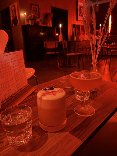 Hip bar featuring cocktails, mezcal, art & DJ music in an intimate, dimly lit setting.