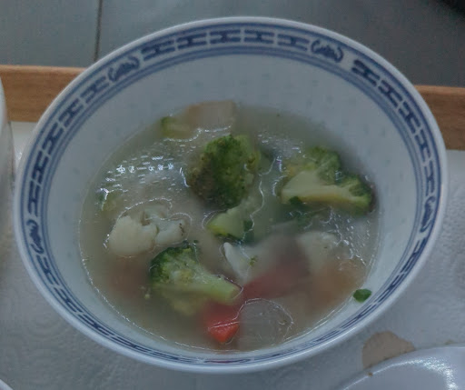 Die Wan Tan Suppe: Ohne Scheiß, es ist einfach nur warmes Wasser in dem Tiefkühlgemüse und fertig Wan Tans schwimmen. Wirklich es schmeckt nur nach Wasser mit leichtem Brokkoli- & Weißkohlgeschmack.
