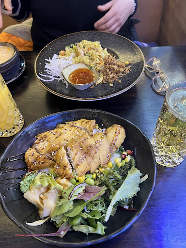 We decided to try this restaurant on a saturday as all the other restaurants in Kantstr. were already fully booked. Unfortunately, we quickly understood the lack of customers... the food was really disappointing and for such a high price. The fried rice tasted like old frying oil and there was almost more fried onions than rice, the "bowl" had so few vegetables, most of it was salad leaves and the sodas were not really carbonated, therefore tasted really bad. For the price, we would have expected much more quality and at least the vegetables listed on the menu. The service was okay, there are a bunch of students working there, chatting and laughing very loudly. The restaurant itself with the big aquarium is...