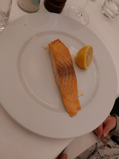 Read moreWir waren Teil einer größeren Gesellschaft, daher haben wir nicht à la carte gegessen sondern hatten hatten eine gemischte Vorspeisenplatten für alle und dann je nach Wahl, Filetsteak, Lachs oder Lamm. Die Vorspeisenplatten: Das Restaurant war zwar recht leer aber anscheinend war die Küche unter Druck und hat beim Caprese keine Zeit gefunden den Mozzarella klein zu machen.... Da lagen die ganzen Kugeln drauf! 🤔 Die größte Enttäuschung auf der Platte war allerdings das Vitello Tonnato. An sich ein tolles Rezept. Hier wurde statt Kalbfleisch irgendein Bratenaufschnitt benutzt und mit einer Art Thunfisch- Mayonnaise überzogen. Sowas hab ich noch nicht erlebt. Zum Hauptgericht Bei ca. 15 anwesenden Personen kamen die Kellner auf die skurrile Idee erst für alle die Hauptspeise zu servieren und 5 min später mit dem Beilagenteller zu kommen. Der separate Teller mag Hip sein aber wenn der Tisch bereits überfüllt ist, ist's halt einfach nur dämlich. Meine Frau hatte den Lachs (siehe Bild). Eigendlich sollte da eine Senfkruste drauf sein und der Kellner bestand auch darauf das da eine ist. Leider konnte.man sie weder sehen noch schmecken. Mein Filetsteak war ohne das jemand gefragt hätte medium-well (was bei einem Filet auseiner Sicht schon zuviel ist). Leider war es trotz durchgängig rosa Farbe (vermutlich sous vide gegart) trocken und noch trauriger, völlig ohne Geschmack.