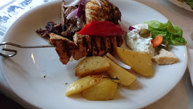 Beim Bifteki kam dann aber die größte Enttäuschung: Beim ersten Biss stieß ich auf extrem harte Stücke (wie Knochen o.Ä.), das Fleisch wirkte roh, und die Füllung war kaum erkennbar. Der Ziegenkäse war nur angedeutet, Oliven und Tomaten dominierten die Füllung.