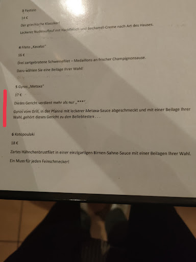 Read moreAlso das was ich bestellt habe hätten auch die Kinder vom Bahnhof Zoo besser zubereiten können. Zumindestens hätte das bei denen mehr Geschmack gehabt. Wenn ein essen schon mit 3 Sternen betitelt wird erwarte ich schon nichts mehr. Trotzdem wurde ich enttäuscht. 17 Euro für Gyros mit metaxa das die Größe eines Kindertellers hat und den Geschmack nach Nichts ist schon respektlos. Das hat einfach keinen Geschmack gehabt. Was ich auch nicht empfehlen kann zu bestellen ist die 0,75 Wasserflasche mit Kohlensäure. Ich hätte nie gedacht, dass man bei Wasser was falsch machen kann oder zumindest es einfach nicht genießbar ist. Um eine Vorstellung zu haben: Hast du schonmal im Schwimmbad voller Chlor ausversehen Wasser in den Mund bekommen? Dann weißt du jetzt was dich erwartet. Das positive das Restaurant war so laut wegen den vielen Menschen, dass man nicht die Musik hören konnte die eine Mischung aus Rock und Pop war. Zumindestens keine...
