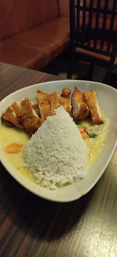The baked chicken is extremly greasy and it's difficult to find a chicken piece there. The same goes for spring rolls which are not eatable at all: they are filled with screbled eggs and some rice nudles or sprouts, not sure about it. Of course baked super greasy. Green curry was not too bad but nothing more than average.