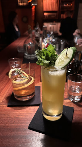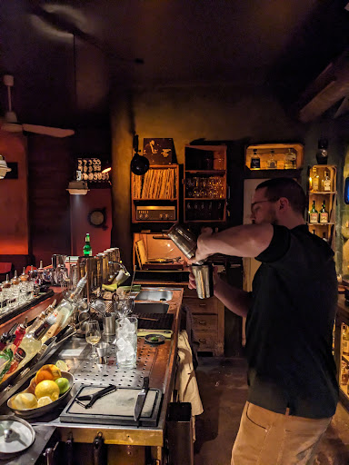I LOVED this bar! It was full and they didn't have a table when we arrived, but were happy for us to stand at the bar and order drinks there. The manager kept track of what order people were coming in, and as soon as a table became free he made sure we were able to sit down. Normally in a bar this cool there is an element of snobbery and you sometimes don't feel welcome, but not this place!! The employees are so friendly and seem genuinely excited to share the place with you. You can tell the bartenders take real pride in their jobs and making amazing drinks and the choice of ingredients to choose from. The low lighting and smoking made for a really cosy atmosphere, and it felt almost like a speakeasy! There were really nice touches throughout, including the fact that the music was on vinyl that the bartenders were choosing and left the record sleeves on show so if you hear a song you like you could check what it was. They also had a little vintage TV on the drink shelf that was playing a video loop of a cat being stroked which I loved. I had a few negronis which were perfectly made, and a "Phillip Seymour" which I believe was rum, bitters and chocolate, and it was divine!! Definitely...