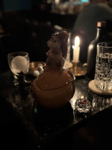 The presentation of the drinks is next level — creative, playful, and full of thoughtful details that really elevate the whole experience. My girlfriend’s drink (“Breakfast at Tiffany’s”) was served in a jewelry box, and mine (“Rescue Rangers”) arrived inside a giant sculpted hazelnut, with the top half acting as a lid and a tiny squirrel perched on top. It was whimsical and impressive — definitely the kind of thing you remember and tell people about.