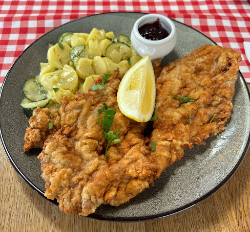 Das Wiener Schnitzel hat eine geschmacklich gute Panade, das Kalbsfleisch ist allerdings etwas zäh. Der Kartoffelsalat ist vergleichsweise klein und salzig.