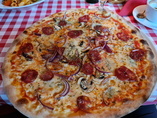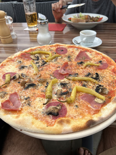 Read moreIch bin schon sehr erstaunt wie gut dieses Lokal bewertet ist. Die Kellner sind super Typen. Bester Service. Aber die ganze Einrichtung inkl. WC und Brauereischirme draußen sind total in die Jahre gekommen und total in der Zeit stehen geblieben. Finde es fast schon etwas staubig. Die Preise sind ziemlich günstig für die heutige Zeit allerdings kann man bei der Qualität der Speisen nicht mehr verlangen. Die Pizza ist groß aber der Teig total pappig und nahezu geschmacksneutral. Null elastisch oder mehlig im Geschmack. Und der Belag der Mista war auch ziemlich unauffällig. Der Salat grobstückig und ebenfalls sehr altmodisch angerichtet. Die Krönung ist dann dass man nur Bar zahlen kann. Spätestens hier wirkt der Laden aus der Zeit gefallen. Nett: eine integrierte Eisdiele glänzt mit großer Auswahl. Und es gibt Bruschetta vorneweg aufs Haus. Die hat mir ehrlich gesagt am besten geschmeckt. Mehr als drei Sterne kann ich beim besten Willen...