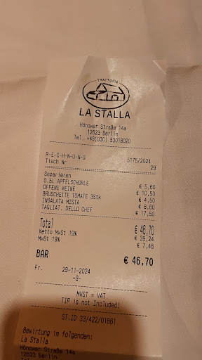 Read moreDer 2. Anlauf war wesentlich besser. Hier kochen und bedienen noch wirklich Italiener, nicht Albaner oder Deutsche, die glauben italienisch kochen zu können. Vielleicht liegt's an der neuen Konkurrrenz von L'Osteria nebenan oder daran, daß wir nicht am Wochenende hier waren, daß alles bessser geworden ist.... Das Essen ist eine uneingeschränkte Empfehlung wert, der Service stimmt. Die Wartezeit aufs Essen war OK, nicht zu lang und nicht zu kurz. Das Personal war freundlich und aufmerksam. Kurzum, nichts zu meckern, nicht mal am Preis. Wir kommen wieder! Haben das neue La Stalla getestet: ist leider keine Empfehlung! Das Essen kam außergewöhnlich schnell, was keine frische Zubereitung vermuten läßt und ist maximal Durchschnitt (Tomatensoße aus der Dose etc.), da gibt es im Stadtbezirk bessere Italiener zu auch noch günstigeren Preisen. Das Personal scheint von dezentem professionellem Service noch nie gehört zu haben, ist aufdringlich, gelangweilt, grenzüberschreitend, arrogant und trägt verbal dick auf beim Lob des eigenen Service. Der Riesensaal ist zwar ganz hübsch rustikal gemacht mit den offenen Deckenbalken, aber es ist sehr laut, gerade wenn dort Gruppen feiern. Die äußere Tür des Windfangs wurde permanent offengehalten, so daß bei jedem Öffnen der Tür die gegenüber sitzenden Gäste die volle Winterkälte abbekamen. Das Warten auf einen freien Tisch (weil Spontanbesuch ohne Reservierung) wurde mit einem Prosecco auf Kosten des Hauses überbrückt, ebenso gab es beim Bezahlen einen Schnaps oder Espresso gratis ("kommt von Herzen"). Trotzdem keine Empfehlung für Leute, die gutes Essen lieben! Und für die gebotene Qualität ist das Lokal...
