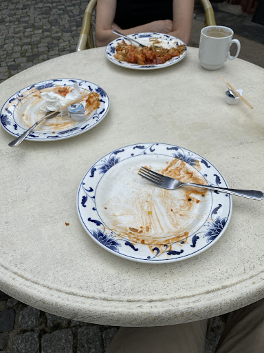 Die flachen Teller worauf man sonst sein Essen bekommt, müssen aus gewesen sein, denn es wurde auf Dessertteller geliefert.
