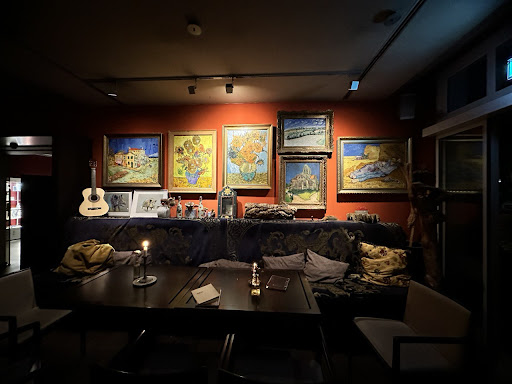 Cool atmosphere. Interior is full of paintings (Van Gogh and others), tastefully arranged. I personally loved wooden old tables with candles on it. Dimmed lights give a really intimate feeling.