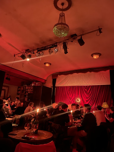 With its wooden floors, scattered vintage tables and chairs, and a stage adorned with classic red curtains, it feels like stepping into a timeless cabaret. The dim lights add to the charm, casting a warm glow over the room's old-school elegance. The massive wooden bar tucked in the corner is the perfect finishing touch, offering not just drinks but an atmosphere straight out of a bygone era.