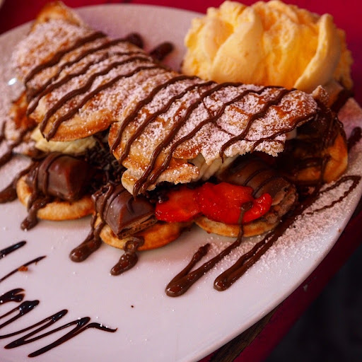 I recommend : 1- happy waffle filled in strawberry with white chocolate & vanilla ice cream. 2- happy waffle filled in kinder bueno with milk chocolate sauce & vanilla ice cream.