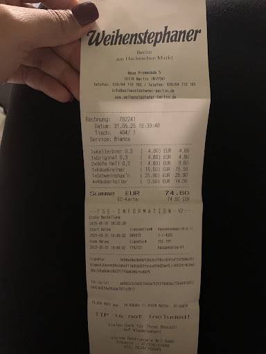 ย ย ย Read moreWe had a disappointing experience at Weihenstephaner Berlin. We were a group of four and ordered just two main dishes and drinks, as we weren't very hungry after a late lunch and snacks earlier.