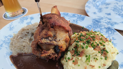 Nach diesem grandiosen Start, und dem perfekten Service, kamen dann die Hauptspeisen, die leider das Erlebnis heruntergerissen haben. Der Rotkohl war mit Zimt überwürzt und extrem verkocht, zahlreiche Beilagen wie Knödel schmeckten wie Fertiggerichte, ebenso das bayrisch Kraut was in seiner originalen Zubereitungsart nichts mit dem zu tun hatte was dort serviert worden ist. Der Krustenbraten war nicht zart, und versalzen, dazu kam noch das nicht von dem Fleisch was serviert worden ist die Kruste dran war, sondern ein kleines Viereck von irgendeinem anderen Stück Fleisch einfach drauf gelegt worden ist. Die Verhältnisse haben überhaupt nicht gestimmt. Die Kartoffel schienen vor geschält und vakuumisiert vor der Zubereitung (reine Spekulation). Die Schweinshaxe war nicht knusprig genug, nicht zart, und insgesamt hatte sie nicht die richtige Temperatur.