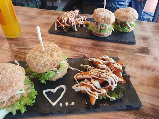 I had boxi burger, which is a menu of two sliders, one of them with deep-fried panko battered bun, and sweet potato fries. Everything is vegan and my food was delicious. I also want to mention that it is a pretty unique style, I don't think you will get anything quite the same anywhere else. Closest I can think of is Tacuza at Magdalenenstr. Textures were great too.