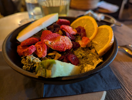 Nice cozy Café. At arrival one has to wait until someone from the staff assigns a seat. After taking a seat the staff brings a menu quite fast. From arrival to being served with my order did not take much time even though the place was almost full. I took a green tea (Midori). Midori tea usually requires less hot water (depending on the very tea 65-75 °C). This one has been served hotter and thus build some bitternis. Recommendation: Serve a small plate for the tea bag as well such that customers have a place for them. Additional I ordered uncle snoop, a yoghurt based dish with dried strawberries, cranberries, mango as well as orange and melon slices. The dish tasted well, but was dominated by the cranberries. Recommendation: Cut the orange and melon slices in quarters such that one can just take a bite. This would make it more convenient to eat. Also add less cranberries and add something like fresh blueberries to balance it out. Generally for fresh ingedrients would help making the dish lighter and more exciting. Alternatively a creamier yoghurt might do the trick as well to add some freshness. Music plays in the background. It is noticable, but talking to other people is perfectly fine. The music supports, but does not disturb. Great. There are some free tampons in the bathroom. Also a fantastic idea. Card payment possible.