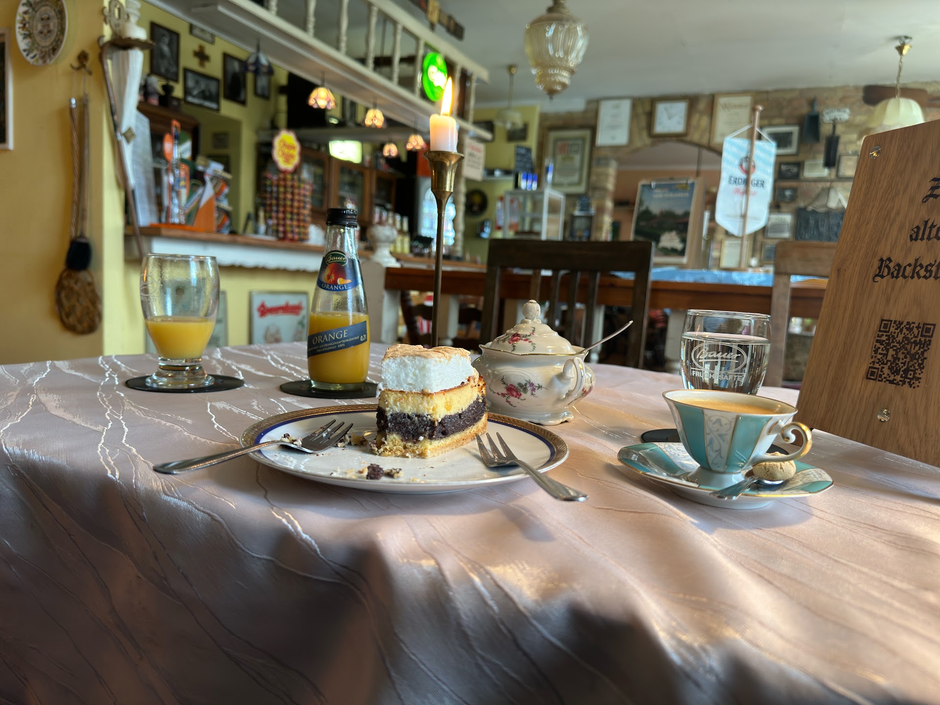 He then offered a free drink as a courtesy. We ordered coffee and cake, and it was exceptional. As someone who enjoys good coffee, I can confidently say that the coffee at this café was much better than that of the famous Berlin coffee roastery shops. The homemade cake with homemade cream was an artistic masterpiece. The quality of all the components of the cake was exceptional. After reading about the history of the café, which has been run by a family for several generations, you could not have expected anything less.