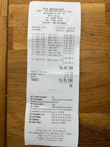 Read moreDas Essen ist sehr gut. Nachschlag wird auf Wunsch gebracht, aber immer berechnet. Das Personal ist freundlich, offen und emphatisch. Allerdings sind nur wenige der MA der Deutschen Sprache mächtig, was ich persönlich nicht nachvollziehen kann, da das Restaurant mit selbigem Betreiber schon seit Jahren am Standort ist. Die Preise wurden kürzlich angepasst und sind im oberen Preissegment €€€ für Restaurants dieser Küche. Daher habe ich das Restaurant "KIM Sushi" mit nur 4** insgesamt bewertet. Man muss auch beim Bestellen auf die Preise achten. Da gab es vor Kurzem noch Preisunterschiede zwischen den Preistafeln und Aufstellern vor dem Restaurant und der Speisekarte im Restaurant (ebenfalls neu). Dabei waren die Speisen & Getränke auf den Preisaufstellern vor dem Restaurant günstiger als auf den neuen Speisekarten im Restaurant. Kassiert wird selbstverständlich auf Basis der Speisekarten im Restaurant...Das gute Essen ist definitiv ein Besuch wert. Bei größeren Gruppen immer vorbestellen oder wenn man zu den gängigen Zeiten mittags oder abends essengehen will, da das Restaurant gut besucht wird. Ansonsten den...