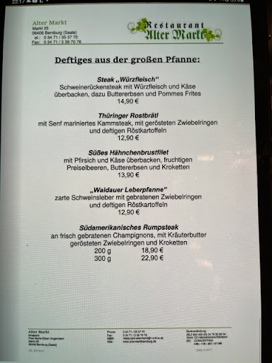 Read moreDas Positive an dem Restaurant ist die Aufmachung im Inneren, wenn auch sehr vollgepackt und viel eingestaubt was auch keinen guten Eindruck macht. Beim Essen muss man abstriche machen, dass liegt wohl daran das entweder vieles vorgekocht ist und dann verkocht ist oder zu viele Köche daran sich versuchen. Der bestellte Zweibelkloß war eher ein Kümmelkloß, bei dem anderen Essen, war auch nicht alles okay aber wie schon beschrieben, zu viele Köche ... . Es gibt so einiges was verbessert werden kann und sollte. Das Bedienungspersonal ist freundlich und geduldig wenn man sich nicht so schnell entscheiden kann. Hausmannskost oder deutsche Küche mit einem hauch Tradition ist was anderes als mancher hier denkt zu essen, Deutsche Küche bezieht sich nicht nur auf Regional. Das Fazit von dem Versuchsessen ist, wenn man Hunger hat, bekommt jeder Gaumen was geboten. Der alte Markt ist für meinen Gaumen eher nicht zu empfehlen aber Geschmäcker sind nun mal unterschiedlich und das ist okay. Als Empfehlung - nicht nur auf deutsche Küche setzen, die ist oft nach Tradition ein schwere Küche. Ein Hauch von anderen Gerichten (Russisch-Böhmisch-Slawisch-...) komponieren, z.B. bei einem 3 Gänge Menü, vorausgesetzt der Kunde...