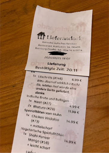 Vor ein paar Jahren wollte ich hier mal spontan mit meinem Vater essen gehen, denn der Eingangsbereich sieht sehr einladend aus, fast königlich! Es gibt eine Klingel, wenn man diese betätigt kommt jemand raus und empfängt seine Gäste. Damals war zwar das Restaurant geöffnet, die ordentlich gekleidete Empfangsdame teilte uns jedoch mit, dass die Küche noch geschlossen sei, weswegen wir dann wo anders essen gegangen sind. Gestern war ich dann mit meinem Freund dort, ebenfalls völlig spontan (das Restaurant befindet sich direkt im Zentrum von Bernburg, wodurch man da öfter mal dran vorbei kommt)! Nachdem wir geklingelt hatten, kam ein Mann raus, und wir hatten beide sofort den Eindruck, dass wir den Herrn bei irgendetwas gestört haben: So, wie er angezogen war hätte man denken können er hätte noch vor einer Minute auf der Couch gelegen und Fern gesehen, sein Gesichtsausdruck wirkte erschrocken, fast verängstigt, weil fremde Leute vor seiner Tür standen - Und obwohl wir beide in diesem Moment den Gedanken hatten am liebsten wieder gehen zu wollen ließen wir uns auf das "Abenteuer" ein! Die zwei Innenräume waren sehr sauber, die Tische waren schon alle gedeckt, die Wände mit Bildern aus Stoff und bunten Schirmen geschmückt, da kann ich absolut nichts gegen sagen - Ich empfand die Atmosphäre dort als gemütlich, auch wenn mir vielleicht noch leise indische Musik oder die Unterhaltungen anderer Gäste im Hintergrund etwas gefehlt hat! Was ich wiederum etwas merkwürdig fand, war, dass wir in den hinteren Raum an einen Tisch ganz hinten geführt wurden, obwohl wir ja nun die einzigen Gäste waren - Sollten wir oder wollte der Gastwirt ungestört sein? Dann ging es um die Getränke: Außer dass ich 4,99 Euro für 0,4 l Mangosaft für ziemlich teuer halte gibt es von meiner Seite aus nichts weiter zu erwähnen. Mein Freund hätte gerne ein Kellerbier gehabt, doch der immer noch so "verunsicherte"(?) Gastwirt teilte ihm dann mit, dass es keins gäbe. Als mein Freund ihn darauf hinwies, dass es aber auf der Karte stehen würde, sagte er: "Heute nicht"! Dann bestellten wir einen gemischten Salat für uns beide, der kam überhaupt nicht - Offensichtlich hatte der Gastwirt das nicht verstanden. Stattdessen bekamen wir zwei kleine Salatschälchen, die aber wohl die Beilage waren: Geschnittener Eisbergsalat mit jeweils einem Stück Tomate, einer Scheibe Gurke, einer halben Orangenscheibe und einem Spritzer Dressing - So etwas hatte ich noch nie gesehen, sehr trostlos, nach zwei Happen war tatsächlich nur noch purer Salat zu sehen! Nun waren wir besonders gespannt, was mit dem Hauptmenü auf uns zukommen würde, und da muss ich sagen sind wir absolut positiv überrascht worden: Ich hatte das so genannte vegetarische Kofta Vindaloo, also Gemüsefrikadellen in pikanter Kokos-Creme-Sauce mit Gemüse, Rosinen, Mandeln und Cashewkernen, dazu noch Reis - Wow!!! Ich kannte das gar nicht, und ich hab' es genossen - Es war sogar so, dass ich zum Schluss schon "gekämpft" habe, weil ich einfach nichts auf dem Teller liegen lassen wollte! Demnach muss ich zugeben, dass ich trotz meiner gemischten Ansichten wieder hingehen würde! Vielleicht war der Herr, der uns empfangen und auch bedient hatte nur eine Vertretung und hatte einfach Angst etwas falsch zu machen!? Mein Menü hatte übrigens 15,99 Euro gekostet, was ich für ein feines Restaurant völlig normal und im Gegensatz zu dem Preis für den Mangosaft schon fast günstig finde! Also, liebe Leser, solltet Ihr mal Appetit auf indische Küche haben und vor der Tür dieses Restaurants stehen, lasst Euch von nichts abschrecken, probiert es einfach mal aus und zieht es bis zum Ende durch - Vielleicht lohnt es sich ja für Euch...
