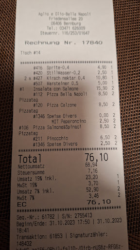 Wir waren seit langer Zeit mal wieder im Bella Napoli. Vom Ambiente her fanden wir es eher ernüchternd. Kaltweiße runde Deckenleuchten z.B. sorgten nicht gerade für "italienische" Gemütlichkeit. Für die Kinder hätte ich mir was zum malen oder ähnliches gewünscht, um die Wartezeit besser zu überbrücken. Der Service war nett und freundlich. Die Getränke und Vorspeisen wurden zügig serviert. Allerdings war das Brot des Bruschetta sowie Knoblauchbrot etwas zu trocken für meinen Geschmack und mit Trockenkräutern statt frischen gewürzt, das geht wesentlich besser. Die Hauptgerichte ließen dann aber auf sich warten, wurden zudem nicht zeitgleich serviert. Meine Pizza Bella Napoli hatte einen recht guten Boden, außen knusprig, gut gebacken, geschmacklich aber etwas zu Käselastig, den Belag hat man wenig rausschmecken können, schade. Gekostet hab ich auch die Spaghetti Bolognese, die Soße war hier richtig lecker, laut Kellner wohl auch stundenlang einreduziert, top. Ansonsten wurde ein Rinderfilet medium bestellt, das Fleisch war aber komplett durch, wenn auch das Filet weiterhin essbar war, für ~30€ aber vom Anspruch her zu wenig. Preislich war es in Ordnung, zum Abschluss gab es noch einen...