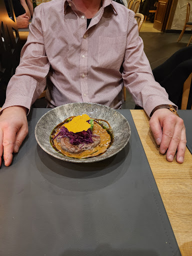 Read moreZum 2. Weihnachtstag gönnen wir uns lecker verwöhnt zu werden. Es war eine Empfehlung von guten Freunden. Es schien gut besucht...da vor der Türe einige Gäste standen. Der erste war ein offen gestaltetes sehr lautes Restaurant. Es gab Tische an den Seiten sowie mittig und ein Nebenraum für größere Gesellschaften. Unser Tisch war leider mittendrin...vor der Ausschanktheke. Somit war ein geschäftiges treiben um unseren Sitzplatz und wirklich sehr laut. Was uns nicht wirklich entspannend erschien. Wir wurden sehr freundlich empfangen und bestellten erstmal 2 kleine Bier. Anschließend bestellten wir 3 Gänge a la carte. Wir hatten gerade bestellt und unser Bier war noch 3/4 gefüllt, der Wein zum Essen stand auch schon auf dem Tisch... da kam schon die Vorspeise. Kaum diese verspeist... kam der Hauptgang, was uns viel zu schnell erschien. Somit ließ ich mein Bier stehen und mein Mann bat um etwas Pause zu seinem Dessert. Der Service entschuldigte sich mehrfach, dass alles so schnell serviert wurde. Nachträglich bestellte ich mir auch noch ein Dessert und hoffte das wir dies gemeinsam genießen können. Als Scherz sagte ich noch "pass auf das steht ruckzuck und ohne Pause gleich hier", da wurde es auch schon serviert. Schade. Natürlich habe ich es dann nicht zurück gehen lassen. Der Service entschuldigte erneut mehrfach und brachte dann das andere Dessert auch sofort. Als kleine Entschuldigung brachten sie uns einen Espresso und einen Schnaps aufs Haus. Somit haben wir unsere 3 bzw. 4 Gänge von 19 bis 20 Uhr verputzt. Das war für uns "als Genießer" sehr schade und natürlich auch nicht förderlich für deren Getränkeumsatz. Eigentlich wollten wir unseren Abend am 2. Weihnachtstag schön gemütlich feiern statt so schnell zu essen in einem hektischem lauten Ambiente. Die einzelnen Gänge waren sehr lecker und der Service sehr freundlich. Schade das wir dies nicht richtig genießen konnten. Vielleicht beim...